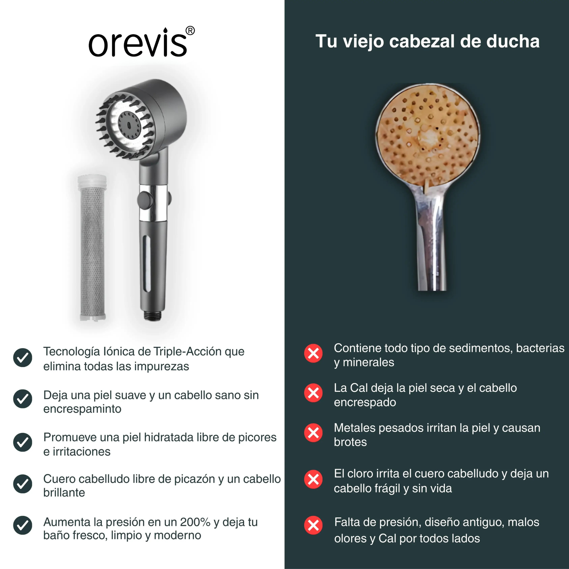El cabezal de ducha Orevis transforma el agua de tu baño eliminando eficazmente la cal, el cloro y los metales pesados mediante su sistema de filtración clínicamente probado, de forma que desde la primera ducha tu piel queda más suave, hidratada y calmada, y tu cabello más brillante, sano y manejable — sin necesidad de cremas ni tratamientos caros.